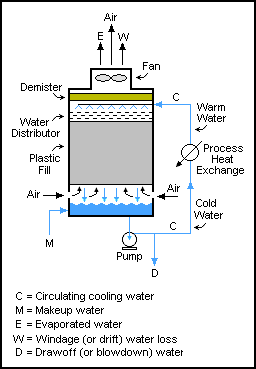 在相邻的图表中,从塔盆泵出的水是流经工业设施中的工艺冷却器和冷凝器的冷却水。冷却水从需要冷却或冷凝的热工艺流程中吸收热量,吸收的热量使循环水升温(C)。热水回流到冷却塔顶部,向下流过塔内的填料。当它向下流动时,它通过自然通风或在塔中使用大型风扇的强制通风,与塔中上升的周围空气接触。这种接触会导致少量的水随着风(W)和一些水(E)的蒸发而流失。蒸发水所需要的热量来自于水本身,它将水冷却回原来的盆地水温,然后水就可以再循环了。蒸发后的水将其溶解的盐留在未蒸发的大部分水中,从而提高了循环冷却水中的盐浓度。为了防止水的盐浓度过高,一部分水被抽走/吹下来(D)处理。向塔盆提供淡水补给(M),以补偿蒸发水、风损水和抽放水的损失。